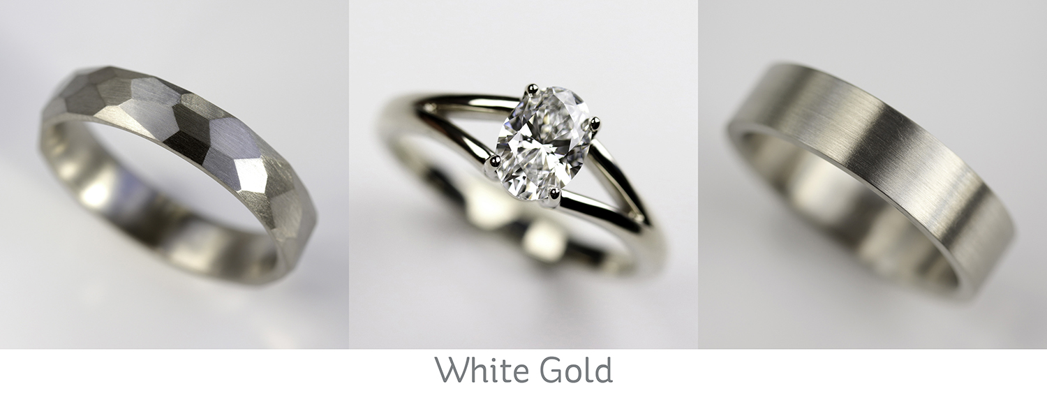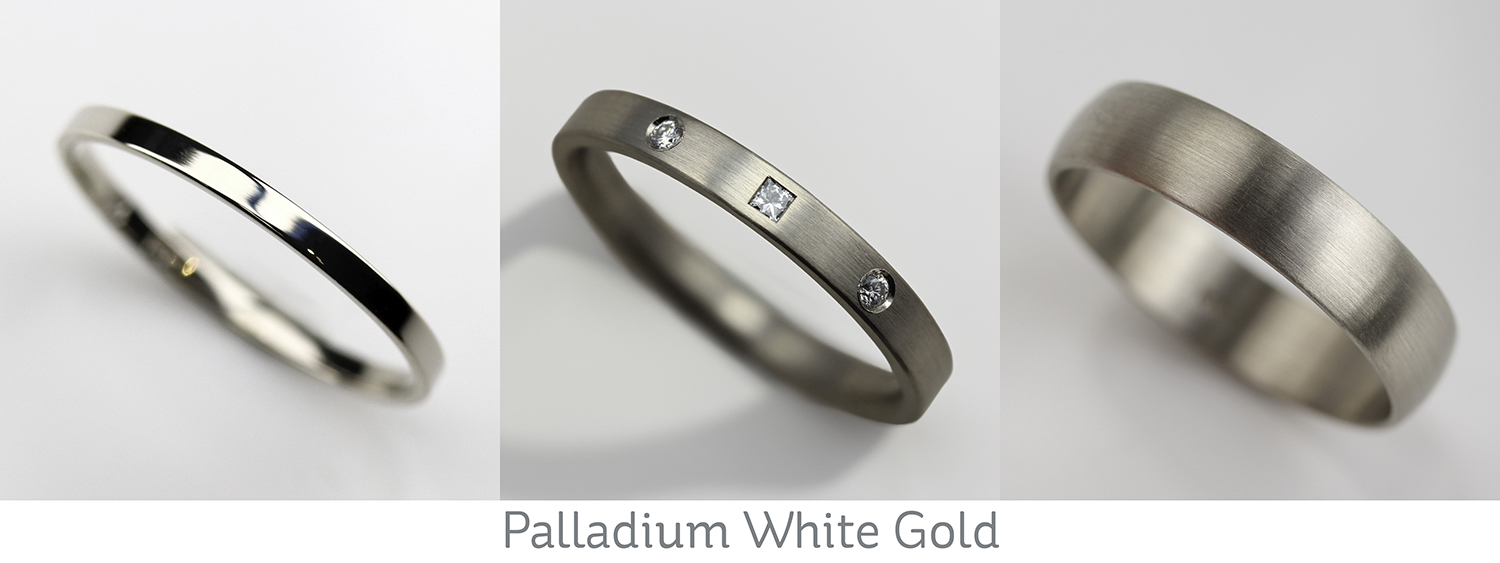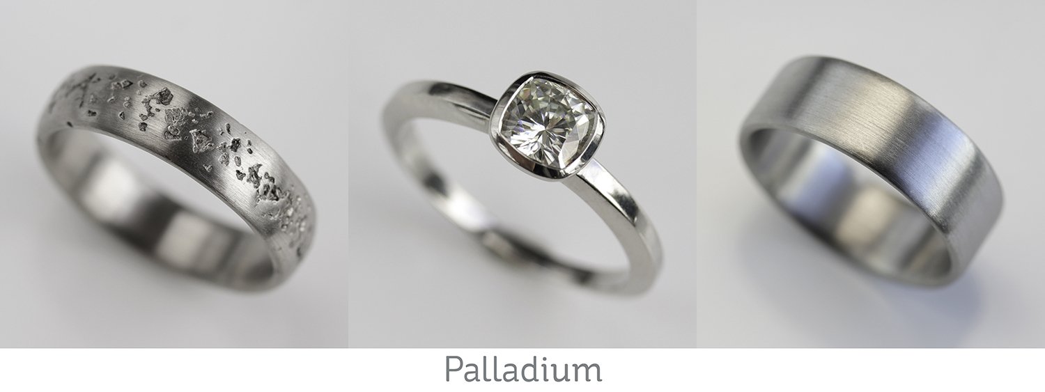 Currently we work with platinum as our white metal alternative to white gold. Platinum offers a similar neutral color but is a bit brighter white than palladium. It is naturally hypoallergenic, and has a great weight and durability that make it ideal for everyday wear and wedding bands.